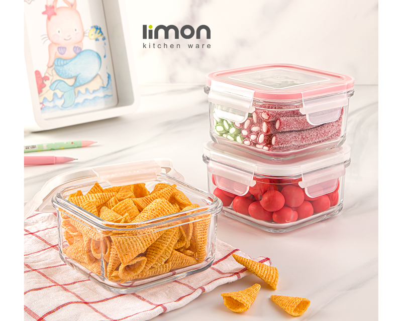 ظرف شیشه ای مربع درب دار ۴۴۰ میلی لیتر لیمون